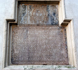 Por esta lápida, colocada en la iglesia del Salvador, vemos la devoción (y obligación) que existía en Sevilla de ponerse de rodillas en el suelo cuando pasase el Santísimo Sacramento, aunque hubiera lodo por haber llovido; piadosa costumbre de la que no se libraba ni siquiera el rey ni los más altos caballeros, so pena de perder el caballo y pagar seiscientos maravedises de multa; y el que no tuviera caballo ni bienes, perder la ropa que llevase puesta.